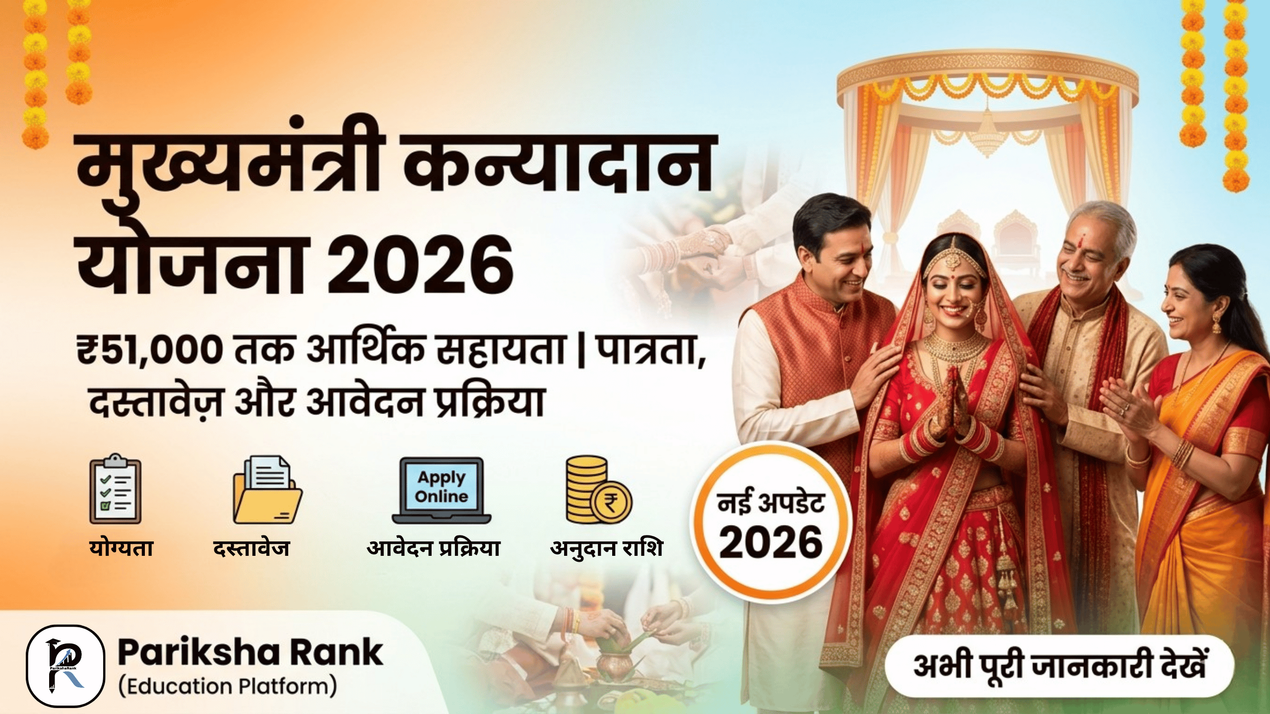 इस ब्लॉग पोस्ट में हम Mukhyamantri Kanyadan Yojana 2026 की पूरी जानकारी, Eligibility, Required Documents और Online Apply करने के स्टेप्स के बारे में विस्तार से जानेंगे।